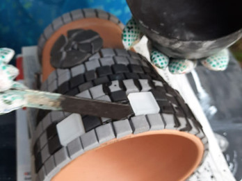 Mozaika trójwymiarowa – na doniczce lub (alternatywnie) płaska podkładka pod garnek.– klejenie, fugowanie, czyszczenie,– możliwość łączenia elementów ceramicznych z treselami lub wykorzystania płytek i rozbitej ceramiki.